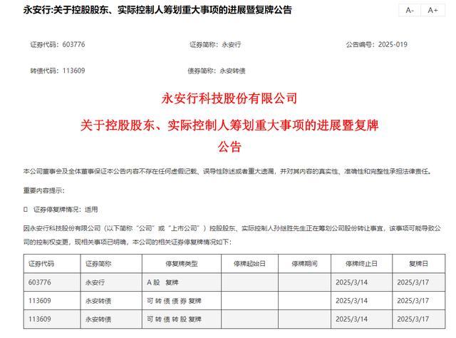 3月16日,停排一周的A股上市公司永安止,发布了一则控股股东、真际控制人料理严峻事项的停顿通告。